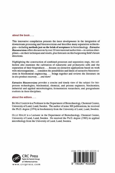 I. Objectives for Extractive Bioconversion 2. Cultivation Using Membrane Filtration and Cell Recycling 3. Liquid-Liquid Extractive Membrane Reactors 4. Continuous Removal of Ethanol from Bioreactor by Pervaporation 5. Perstraction. 6. Extractive Bioconversions with Nonaqueous Solvents7. Extractive Bioconversions in Aqueous Two-Phase Systems. 8. Solid Sorbents Used in Extractive Bioconversion Processes. 9. Extractive Removal of Product by Biocatalysis. 10. Vacuum Fermentation 11.Bioconversions in Permeabilized Cells. 12. Ion-Pair Extraction in Biological Systems 13. The Biostil Process. Index