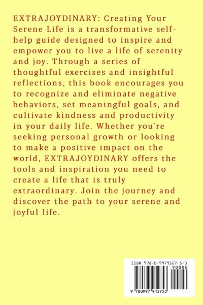 EXTRAJOYDINARY: Creating Your Serene Life is a transformative self-help guide designed to inspire and empower you to live a life of serenity and joy. Through a series of thoughtful exercises and insightful reflections, this book encourages you to recognize and eliminate negative behaviors, set meaningful goals, and cultivate kindness and productivity in your daily life. Whether you're seeking personal growth or looking to make a positive impact on the world, EXTRAJOYDINARY offers the tools and inspiration you need to create a life that is truly extraordinary. Join the journey and discover the path to your serene and joyful life.