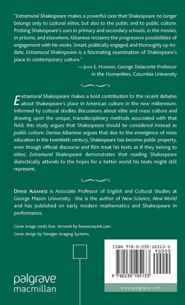 " Extramural Shakespeare makes a powerful case that Shakespeare no longer belongs only to cultural elites, but also to the public and to public culture. Probing Shakespeare's uses in primary and secondary schools, in the movies, in prisons, and elsewhere, Albanese reclaims the progressive possibilities of engagement with his works. Smart, politically engaged, and thoroughly up-to-date, Extramural Shakespeare is a fascinating examination of Shakespeare's place in contemporary culture." - Jean E. Howard, George Delacorte Professor in the Humanities, Columbia University