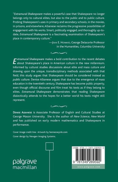 " Extramural Shakespeare makes a powerful case that Shakespeare no longer belongs only to cultural elites, but also to the public and to public culture. Probing Shakespeare's uses in primary and secondary schools, in the movies, in prisons, and elsewhere, Albanese reclaims the progressive possibilities of engagement with his works. Smart, politically engaged, and thoroughly up-to-date, Extramural Shakespeare is a fascinating examination of Shakespeare's place in contemporary culture." - Jean E. Howard, George Delacorte Professor in the Humanities, Columbia University