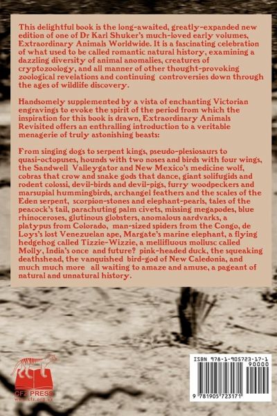 This delightful book is the long-awaited, greatly-expanded new edition of one of Dr Karl Shuker's much-loved early volumes, Extraordinary Animals Worldwide. It is a fascinating celebration of what used to be called romantic natural history, examining a dazzling diversity of animal anomalies, creatures of cryptozoology, and all manner of other thought-provoking zoological revelations and continuing controversies down through the ages of wildlife discovery. Handsomely supplemented by a vista of enchanting Victorian engravings to evoke the spirit of the period from which the inspiration for this book is drawn, Extraordinary Animals Revisited offers an enthralling introduction to a veritable menagerie of truly astonishing beasts: From singing dogs to serpent kings, pseudo-plesiosaurs to quasi-octopuses, hounds with two noses and birds with four wings, the Sandwell Valleygator and New Mexico's medicine wolf, cobras that crow and snake gods that dance, giant solifugids and rodent colossi, devil-birds and devil-pigs, furry woodpeckers and marsupial hummingbirds, archangel feathers and the scales of the Eden serpent, scorpion-stones and elephant-pearls, tales of the peacock's tail, parachuting palm civets, missing megapodes, blue rhinoceroses, glutinous globsters, anomalous aardvarks, a platypus from Colorado, man-sized spiders from the Congo, de Loys's lost Venezuelan ape, Margate's marine elephant, a flying hedgehog called Tizzie-Wizzie, a mellifluous mollusc called Molly, India's once (and future?) pink-headed duck, the squeaking deathshead, the vanquished bird-god of New Caledonia, and much much more - all waiting to amaze and amuse, a pageant of natural and unnatural history.