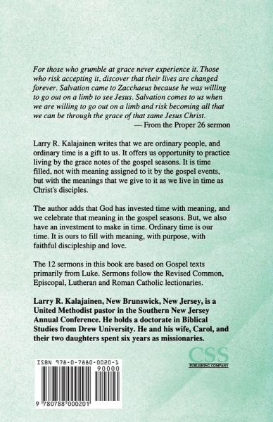 For those who grumble at grace never experience it. Those who risk accepting it, discover that their lives are changed forever. Salvation came to Zacchaeus because he was willing to go out on a limb to see Jesus. Salvation comes to us when we are willing to go out on a limb and risk becoming all that we can be through the grace of that same Jesus Christ. -- from the Proper 26 sermon Larry R. Kalajainen writes that we are ordinary people, and ordinary time is a gift to us. It offers us opportunity to practice living by the grace notes of the gospel seasons. It is time filled, not with meaning assigned to it by the gospel events, but with the meanings that we give to it as we live in time as Christ's disciples. The author adds that God has invested time with meaning, and we celebrate that meaning in the gospel seasons. But, we also have an investment to make in time. Ordinary time is our time. It is ours to fill with meaning, with purpose, with faithful discipleship and love. The twelve sermons in this book are based on gospel texts primarily from Luke. Sermons follow the Revised Common, Episcopal, Lutheran, and Roman Catholic lectionaries. Larry R. Kalajainen, New Brunswick, New Jersey, is a United Methodist pastor in the Southern New Jersey Annual Conference. He holds a doctorate in Biblical Studies from Drew University. He and his wife, Carol, and their two daughters spent six years as missionaries.