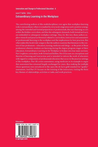 Extraordinary Learning in the Workplace is broken into four main sections. Part I explores curriculum, both formal and hidden. Part II focuses on conceptions and theories of learning and instruction and is intended to inform the work of educators with regard to components of professional education that occur in the practice settings of the workplace. Part III covers assessment, using medicine as its example to argue that assessment has remained largely unchanged for years, thus making the multiple choice questions tests introduced in the 1950s the de facto gold standard for "quality" assessment. And Part IV focuses on the training of the instructors, visiting the three key themes of relationships, activities or tasks, and work practices.