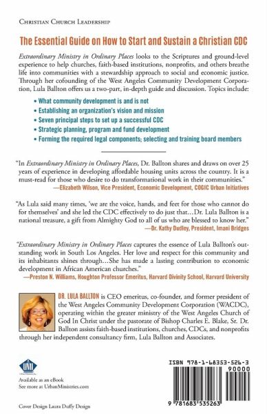 The Essential Guide on How to Start and Sustain a Christian CDC Extraordinary Ministry in Ordinary Places looks to the Scriptures and ground-level experience to help churches, faith-based institutions, nonprofits, and others breathe life into communities with a stewardship approach to social and economic justice. Through her cofounding of the West Angeles Community Development Corporation, Lula Ballton offers us a two-part, in-depth guide and discussion. Topics include: What community development is and is not Establishing an organization’s vision and mission Seven principal steps to set up a successful CDC Strategic planning, program and fund development Forming the required legal components Selecting and training board members