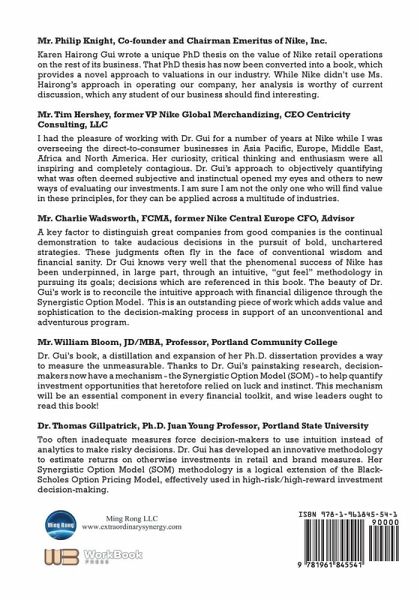 This book is not generated from any Artificial Intelligence tools or platforms.The valuation model in this book is developed and configured by the author.The author wishes to apologize in advance for any syntax mistakes. Have you been to Nike Flagship stores? You might think these significant investments were made based on careful financial calculations. Yes and No. They were actually made based on the financials and on the leaders' instinctive beliefs in their assessments. Quite interestingly, these decisions turned out to be right! This book is not an academic textbook. It is a global sportswear market eye-opening read. This book presents a groundbreaking valuation method, showcased through real-world case studies of Nike's flagship store investments worldwide. Dr. Gui's Synergistic Option Model (SOM) serves as a valuable complement to conventional valuation approaches by effectively quantifying the hidden synergistic value of strategic investments. The SOM reveals that experienced leaders' decisions driven by gut feelings are often both strategic and financially viable in the long term, provided their instincts are accurate. By extending the renowned Black Scholes Option Pricing Model (BSOPM), the SOM allows for the quantification of leaders' gut feelings prior to making substantial investments. Developed using Nike's proprietary data in an unbiased manner, the SOM demonstrates its capability to provide precise forecasts for strategic financial decisions that were previously challenging to quantifyaccurately.