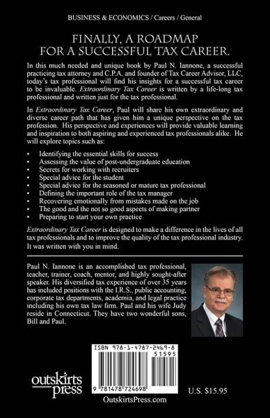In this much needed and unique book by Paul N. Iannone, a successful practicing tax attorney and C.P.A. and founder of Tax Career Advisor, LLC, today's tax professional will find his insights for a successful tax career to be invaluable. Extraordinary Tax Career is written by a life-long tax professional and written just for the tax professional. In Extraordinary Tax Career, Paul will share his own extraordinary and diverse career path that has given him a unique perspective on the tax profession. His perspective and experiences will provide valuable learning and inspiration to both aspiring and experienced tax professionals alike. He will explore topics such as: Identifying the essential skills for success ... Assessing the value of post-undergraduate education ... Secrets for working with recruiters ... Special advice for the student ... Special advice for the seasoned or mature tax professional ... Defining the important role of the tax manager ... Recovering emotionally from mistakes made on the job ... The good and the not so good aspects of making partner ... Preparing to start your own practice ... Extraordinary Tax Career is designed to make a difference in the lives of all tax professionals and to improve the quality of the tax professional industry. It was written with you in mind.