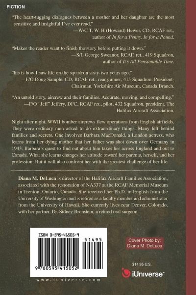"The heart-tugging dialogues between a mother and her daughter are the most sensitive and insightful I've ever read."-W/C T. W. H (Howard) Hewer, CD, RCAF ret., author of In for a Penny, In for a Pound. "Makes the reader want to finish the story before putting it down."-S/L George Sweanor, RCAF, ret., 419 Squadron, author of It's All Pensionable Time. "his is how I saw life on the squadron sixty-two years ago."-F/O Doug Sample, CD, RCAF ret., rear gunner, 415 Squadron, President-Chairman, Yorkshire Air Museum, Canada Branch. "An untold story, aircrew and their families. Accurate, moving, and compelling."-F/O "Jeff" Jeffery, DFC, RCAF ret., pilot, 432 Squadron, president, The Halifax Aircraft Association. Night after night, WWII bomber aircrews flew operations from English airfields. They were ordinary men asked to do extraordinary things. Many left behind families and secrets. One involves Barbara MacDonald, a London actress, who learns from her dying mother that her father was shot down over Germany in 1943. Barbara's quest to find out about him takes her across England and out to Canada. What she learns changes her attitude toward her parents, herself, and her profession. But it will also confront her with the greatest challenge of her life.