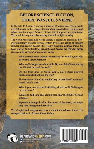 BEFORE SCIENCE FICTION, THERE WAS JULES VERNE In the late 19 Century, during a span of 42 years, Jules Verne wrote over 50 novels in the Voyages Extraordinaires collection. His style and subject matter shaped Science Fiction into the genre we now know. Verne led the way, and his amazing tales still delight us today. The North American Jules Verne Society is pleased to present its first-ever anthology of short stories, written by a select group of modern authors, inspired by classics like Twenty Thousand Leagues Under the Seas, Journey to the Center of the Earth, and Around the World in Eighty Days, as well as Verne's many other works. What secrets await a salvage team raising the Nautilus, and who else wants that submarine? What really happened when Nellie Bly met Jules Verne during her 1889 trip around the world? On the front lines of World War I, did a steam-powered mechanical elephant join the fray? The Baltimore Gun Club wouldn't try to alter Earth's rotational speed-would they? What if your son recreated a thrilling chapter of 20,000 Leagues in your house? What is so odd, very odd, about a particular shop full of Vernian antiques? Mysterious beings dwell at the center of the Earth, but might they take revenge on the surface? Verne's spirit and imagination remain vibrant and relevant today. His voyages continue in Extraordinary Visions.