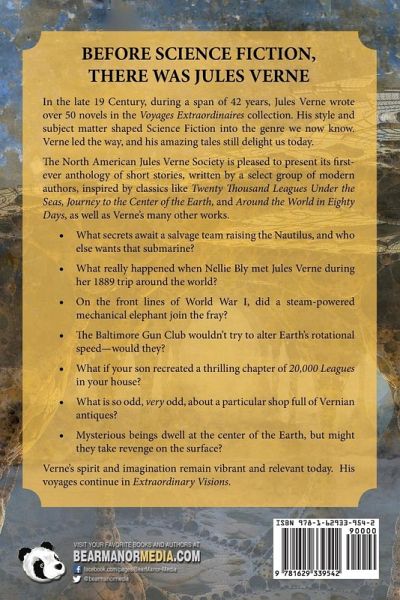 BEFORE SCIENCE FICTION, THERE WAS JULES VERNE In the late 19 Century, during a span of 42 years, Jules Verne wrote over 50 novels in the Voyages Extraordinaires collection. His style and subject matter shaped Science Fiction into the genre we now know. Verne led the way, and his amazing tales still delight us today. The North American Jules Verne Society is pleased to present its first-ever anthology of short stories, written by a select group of modern authors, inspired by classics like Twenty Thousand Leagues Under the Seas, Journey to the Center of the Earth, and Around the World in Eighty Days, as well as Verne's many other works. What secrets await a salvage team raising the Nautilus, and who else wants that submarine? What really happened when Nellie Bly met Jules Verne during her 1889 trip around the world? On the front lines of World War I, did a steam-powered mechanical elephant join the fray? The Baltimore Gun Club wouldn't try to alter Earth's rotational speed-would they? What if your son recreated a thrilling chapter of 20,000 Leagues in your house? What is so odd, very odd, about a particular shop full of Vernian antiques? Mysterious beings dwell at the center of the Earth, but might they take revenge on the surface? Verne's spirit and imagination remain vibrant and relevant today. His voyages continue in Extraordinary Visions.