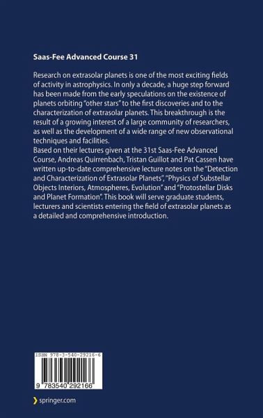Based on their lectures given at the 31st Saas-Fee Advanced Course, Andreas Quirrenbach, Tristan Guillot and Pat Cassen have written up up-to-date comprehensive lecture notes on the "Detection and Characterization of Extrasolar Planets", "Physics of Substellar Objects Interiors, Atmospheres, Evolution" and "Protostellar Disks and Planet Formation". This book will serve graduate students, lecturers and scientists entering the field of extrasolar planets as detailed and comprehensive introduction.