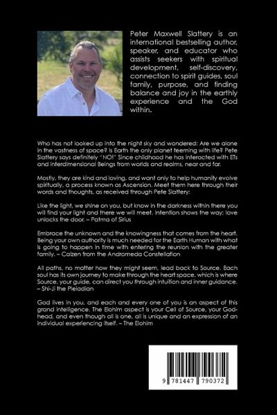 Who has not looked up into the night sky and wondered: Are we alone in the vastness of space? Is Earth the only planet teeming with life? Pete Slattery says definitely "NO!" Since childhood he has interacted with ETs and interdimensional Beings from worlds and realms, near and far. Mostly, they are kind and loving, and want only to help humanity evolve spiritually, a process known as Ascension. Meet them here through their words and thoughts, as received through Pete Slattery: Like the light, we shine on you, but know in the darkness within there you will find your light and there we will meet. Intention shows the way; love unlocks the door. - Patma of Sirius Embrace the unknown and the knowingness that comes from the heart. Being your own authority is much needed for the Earth Human with what is going to happen in time with entering the reunion with the greater family. - Calzen from the Andromeda Constellation All paths, no matter how they might seem, lead back to Source. Each soul has its own journey to make through the heart space, which is where Source, your guide, can direct you through intuition and inner guidance. - Shi-Ji the Pleiadian God lives in you, and each and every one of you is an aspect of this grand intelligence. The Elohim aspect is your Cell of Source, your Godhead, and even though all is one, all is unique and an expression of an individual experiencing itself. - The Elohim