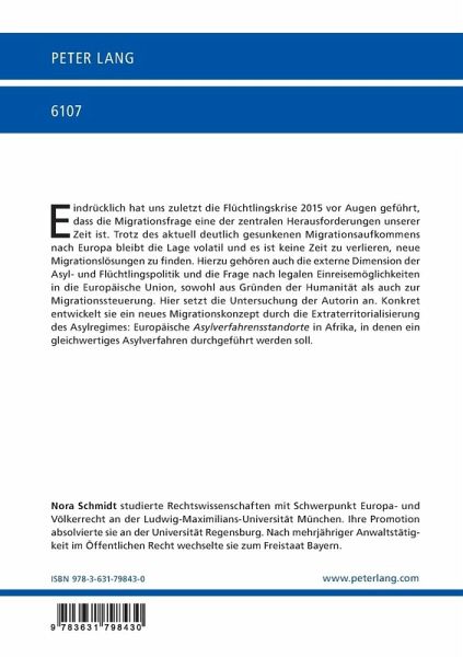 Eindrücklich hat uns zuletzt die Flüchtlingskrise 2015 vor Augen geführt, dass die Migrationsfrage eine der zentralen Herausforderungen unserer Zeit ist. Trotz des aktuell deutlich gesunkenen Migrationsaufkommens nach Europa bleibt die Lage volatil und es ist keine Zeit zu verlieren, neue Migrationslösungen zu finden. Hierzu gehören auch die externe Dimension der Asyl- und Flüchtlingspolitik und die Frage nach legalen Einreisemöglichkeiten in die Europäische Union, sowohl aus Gründen der Humanität als auch zur Migrationssteuerung. Hier setzt die Untersuchung der Autorin an. Konkret entwickelt sie ein neues Migrationskonzept durch die Extraterritorialisierung des Asylregimes: Europäische Asylverfahrensstandorte in Afrika, in denen ein gleichwertiges Asylverfahren durchgeführt werden soll.