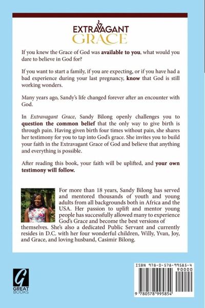 If you knew the Grace of God was available to you, what would you dare to believe in God for? If you want to start a family, if you are expecting, or if you have had a bad experience during your last pregnancy, know that God is still working wonders. Many years ago, Sandy's life changed forever after an encounter with God. In Extravagant Grace, Sandy Bilong openly challenges you to question the common belief that the only way to give birth is through pain. Having given birth four times without pain, she shares her testimony for you to tap into God's grace. She invites you to build your faith in the Extravagant Grace of God and believe that anything and everything is possible. After reading this book, your faith will be uplifted, and your own testimony will follow.