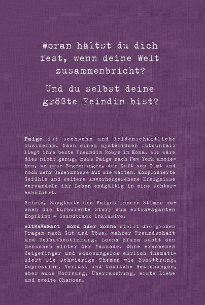 Songtexte zusammen und gehen durch dick und dünn. Seid diesem tragischen Ereignis ist für Paige nichts…mehrIn dieser Geschichte geht es um die 16 Jährige Paige Aljaska Courtney . Ihre beste Freundin Raven Alice Obyn -> Spitzname Robyn, die ebenfalls 16 Jahre alt ist liegt nach einem schweren Autounfall im Koma.Die beiden sind das was man unzertrennlich nennt. Sie lieben beide die Musik,schreiben Songtexte zusammen und gehen durch dick und dünn. Seid diesem tragischen Ereignis ist für Paige nichts mehr wie es vorher war. Es geht ihr nicht sonderlich gut. Besser gesagt so schlecht, dass ihre Mutter sie vor die Wahl stellt. Entweder sie lässt sich in eine Klinik einweisen oder sie zieht von ihrer Heimatstadt Boston aus nach New York zu ihrem Vater. Doch nicht nur die Tatsache das ihre beste Freundin im Koma liegt sorgt bei Paige für Probleme, sondern auch andere Dinge die ich hier nicht nennen will weil es spoilert. Diese Probleme sind so schwerwiegend das Paige ihnen nicht so leicht davon laufen kann. Auch nicht mit dem Umzug in ein anderes Land.