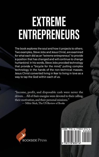 The book explores the soul and how it projects to others. Two examples, Steve Jobs and Jesus Christ, are examined for what each did as an "extreme entrepreneur," to provide a position that has changed and will continue to change humankind. In his words, Steve Jobs provided technology that provide a "bicycle for the mind," putting complex technology in the hands of the non-technical masses. Jesus Christ converted living in fear to living in love as a way to tap the God within each of us.