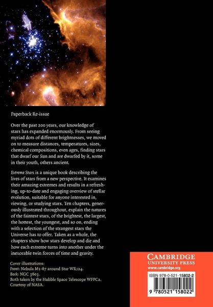 Over the past 200 years, our knowledge of stars has expanded enormously. From seeing myriad dots of different brightnesses, we moved on to measure distances, temperatures, sizes, chemical compositions, even ages, finding stars that dwarf our Sun and are dwarfed by it, some in their youth, others ancient. First published in 2001, Extreme Stars describes the lives of stars from a fascinating perspective. It examines their amazing extremes and results in an engaging overview of stellar evolution, suitable for anyone interested in viewing or studying stars. Ten chapters, generously illustrated throughout, explain the natures of the brightest, the largest, the hottest, the youngest, and so on, ending with a selection of the strangest stars the Universe has to offer. Taken as a whole, the chapters show how stars develop and die and how each extreme turns into another under the inexorable twin forces of time and gravity.