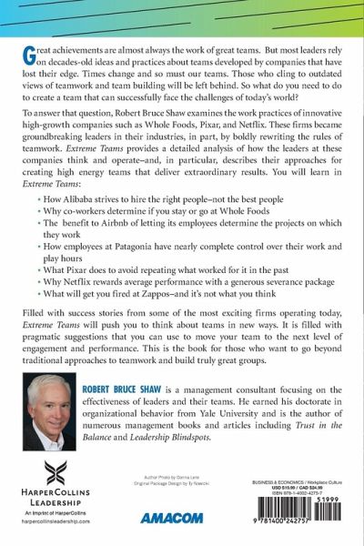 Advance praise for Extreme Teams "There is a new generation of firms experimenting with bold new ways of using teams, and in Extreme Teams Robert Shaw shows how they do it. Through his masterful storytelling and engaging analysis, Shaw offers revealing insights and practical lessons for team leaders who want their own groups to perform at much higher levels. Extreme Teams is a powerhouse book and a fascinating inside look at what it takes to be innovative in how we design and manage teams in the age of disruption. The stories alone are worth the price of the book; the payoff you'll get from putting the lessons to work makes Extreme Teams invaluable." -- Jim Kouzes, coauthor of the bestselling business classic, The Leadership Challenge, and the Dean's Executive Fellow of Leadership, Leavey School of Business, Santa Clara University "Putting together a great team may seem like catching lightning in a bottle, but the truth is that you can build one. You just need the right guide, and that's Shaw's Extreme Teams. Packed with real-world examples, Extreme Teams equips you with the priorities and knowledge you need to build outstanding teams that can disrupt your business in all the right ways! Outstanding!"-- Marshall Goldsmith, bestselling author or editor of 35 books, including What Got You Here Won't Get You There and Triggers "The best companies rely on teams to deliver the results they need. But too many leaders underestimate the creativity and persistence needed to design and manage teams effectively. Extreme Teams describes how innovative companies are pushing the boundaries in regard to teams. A fascinating study of innovation that vividly illustrates the future of teamwork. Highly recommended for leaders who want to create a culture that fosters superior team performance in their own organizations." -- Linda P. Hudson, Chairman and CEO of The Cardea Group; former President and CEO of BAE Systems Inc. and Chief Operating Officer, BAE Systems plc "Cutting-edge organizations are constantly experimenting with creative approaches to team building. Extreme Teams shares their success practices, and we learn how to fully ignite the performance and results of our own teams." -- Frances Hesselbein, Office of the President and CEO, The Frances Hesselbein Leadership Institute; Editor-in-Chief of the award-winning quarterly, Leader to Leader