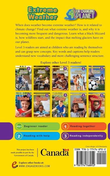 When does weather become extreme weather? How is it related to climate change? Find out what extreme weather is, and why it is becoming more frequent and dangerous. Learn what a black blizzard is, how wildfires start, and the impact that melting glaciers have on our planet. Level 3 readers are aimed at children who are reading by themselves and can grasp new concepts. Key words and captions help readers understand new vocabulary and more challenging sentence structure. ¿¿This project has been made possible in part by the Government of Canada.