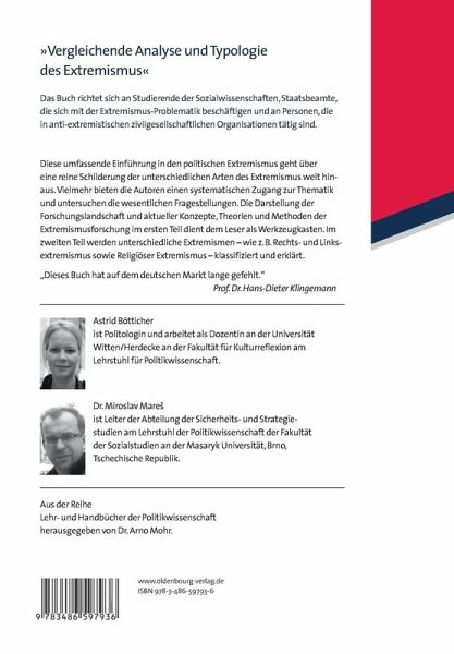 Die Darstellung der Forschungslandschaft und aktueller Konzepte, Theorien und Methoden der Extremismusforschung im ersten Teil dient dem Leser gewissermaßen als Werkzeugkasten. Im zweiten Teil werden unterschiedliche Extremismen - wie z.B. Rechts- und Linksextremismus sowie Religiöser Extremismus - klassifiziert und erklärt.