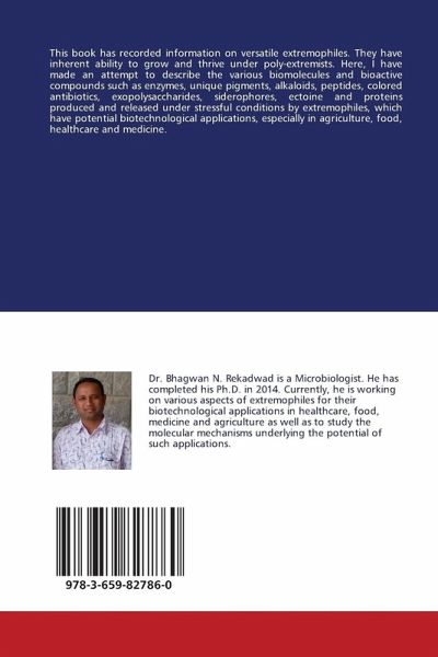 This book has recorded information on versatile extremophiles. They have inherent ability to grow and thrive under poly-extremists. Here, I have made an attempt to describe the various biomolecules and bioactive compounds such as enzymes, unique pigments, alkaloids, peptides, colored antibiotics, exopolysaccharides, siderophores, ectoine and proteins produced and released under stressful conditions by extremophiles, which have potential biotechnological applications, especially in agriculture, food, healthcare and medicine.