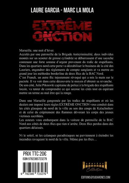 Marseille, une nuit d'hiver. Acculés par une patrouille de la Brigade Anticriminalité, deux individus montés sur un scooter grosse cylindrée se débarrassent d'une sacoche contenant une forte somme d'argent provenant du trafic de stupéfiants. Dans les quartiers nord, cette perte va déstabiliser le business de la cité des Lauriers, engendrer des règlements de compte sanglants et va mettre au grand jour les méthodes borderline de deux flics de la BAC Nord. C'est Franck, un autre flic injustement révoqué qui a mis la main sur le pactole. Il va voir dans cette découverte le moyen d"obtenir sa revanche. De son côté, Julie Pikoswki capitaine de police à la brigade des stupéfiants locale, va tenter de comprendre ce qui secoue les cités tout en espérant mettre un terme au mal être qui la ronge. Dans une Marseille gangrenée par les trafics de stupéfiants et où les dealers ont imposé leurs règles EXTRÊME ONCTION vous conduit dans les cités glauques du nord de la ville au son des coups de Kalachnikov et de celui du crépitement des flammes dévorant les corps des jeunes victimes sacrifiées. Les auteurs vous embarquent dans la voiture de patrouille de la BAC Nord aux côtés de deux flics que rien n'arrête. Deux flics perdus dans des quartiers délaissés. Ni le soleil, ni les calanques paradisiaques ne parviennent à éteindre les incendies ravageant le nord de la ville. Même pas les flics...