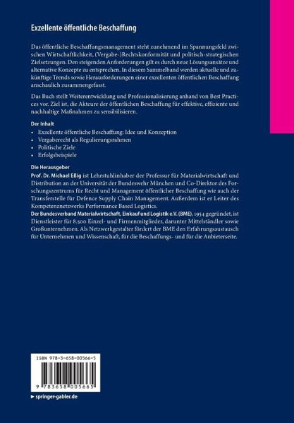Das öffentliche Beschaffungsmanagement steht zu nehmend im Spannungsfeld zwischen Wirtschaftlichkeit, (Vergabe-)Rechtskonformität und politisch strategischen Zielsetzungen. Den steigenden Anforderungen gilt es durch neue Lösungsansätze und alternative Konzepte zu entsprechen. In diesem Sammelband werden aktuelle und zukünftige Trends sowie Herausforderungen einer exzellenten öffentlichen Beschaffung anschaulich zusammengefasst.