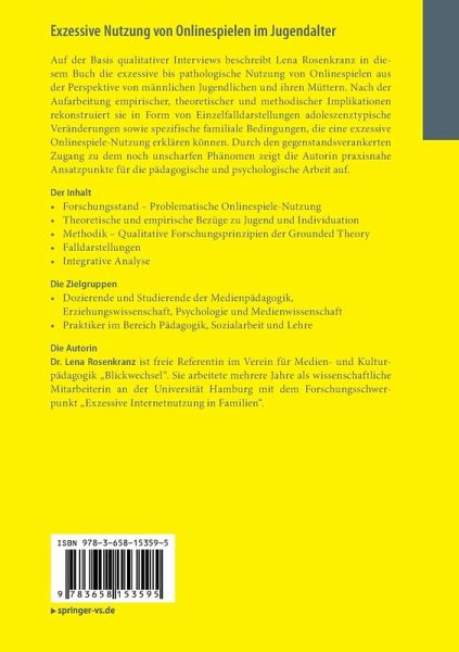 Auf der Basis qualitativer Interviews beschreibt Lena Rosenkranz in diesem Buch die exzessive bis pathologische Nutzung von Onlinespielen aus der Perspektive von männlichen Jugendlichen und ihren Müttern. Nach der Aufarbeitung empirischer, theoretischer und methodischer Implikationen rekonstruiert sie in Form von Einzelfalldarstellungen adoleszenztypische Veränderungen sowie spezifische familiale Bedingungen, die eine exzessive Onlinespiele-Nutzung erklären können. Durch den gegenstandsverankerten Zugang zu dem noch unscharfen Phänomen zeigt die Autorin praxisnahe Ansatzpunkte für die pädagogische und psychologische Arbeit auf.