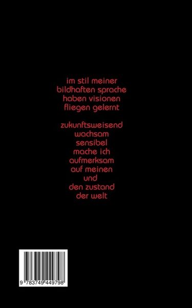 Exitanz, surreale PoesieIm Stil meiner bildhaften Sprache haben Visionen fliegen gelernt. Zukunftsweisend, wachsam, sensibel mache ich aufmerksam auf meinen und den Zustand der Welt.