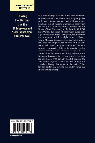 Mount Wilson Observatory: An Incredible Discovery That Kept Albert Einstein up at Night.- Parkes Observatory: When One Star Is More Brilliant Than A Galaxy.- Big Ear: Wow! The Possible Signal from an Alien Civilzation!.- European Southern Observatory: The Reigning King of Optical Telescopes.- Arecibo Observatory: Forty Years on the Throne of Radio Telescope.- Mauna Kea Observatories: Space-Time Magic Was Invented!.- RATAN-600: Sky Lord of the Ring.- Very Large Array: I Can Gain Vigor with Age!.- LAMOST: Is Sky the Limit?.- ALMA Observatory: A Cosmic Eyewitness of Birth and Demise.- China's "Eye of Heaven" (FAST): The New King Taking Its Place atop Radio Telescope.- LHAASO: Participating in the Resolution of a Century-Old Mystery about the Source of Cosmic Rays.- SKA: The Next Storm in the Field of Astronomy.- Viking: Explore that Red Planet.- MER: Small Body, Big Achievement.- Voyager: A Journey of the Solar System.- Cassini-Huygens: Enter Saturn's Rings and Ice.- Stardust: Capture Dusts from Comets.- SOHO: Coexist with Fidgety Stars.- Hipparcos: Measure the Milky Way Precisely.- Spitzer: Reveal the Frozen Cosmos.- Chandra: Explore the Roaring Universe.- Hubble: Build an Unprecedented Perspective on the Cosmos.- WMAP: Depict the Universe in Its Infancy.- DAMPE: DArk Matter Particle Explorer.- Webb: The Most Expensive Space Telescope in History.- CHASE (Chinese H Solar Explorer): China's First Solar Exploration Satellite.