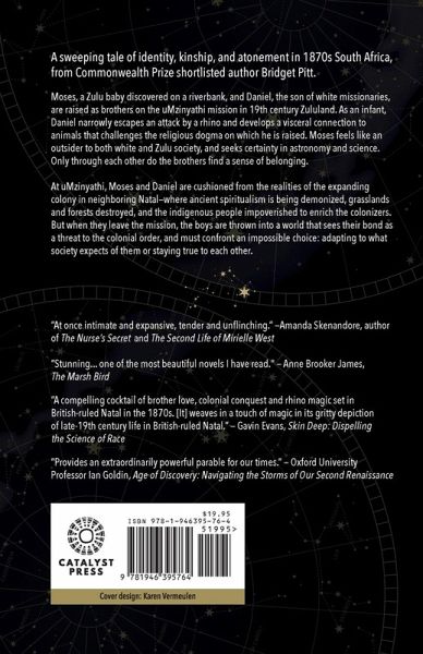 From Commonwealth Book Prize Shortlisted Author Bridget Pitt Finalist for the Tuscarora Award for Historical Fiction and the Sunday Times Literary Fiction Long List A Zulu foundling and a white missionary’s child raised as brothers in a world intent on making them enemies. A sweeping tale of identity, kinship, and atonement, set in 1870s South Africa, a decade of ruthless colonial aggression against the nation's indigenous people. Moses, a Zulu baby discovered on a riverbank, and Daniel, the son of white missionaries, are raised as brothers on the Umzinyathi mission in 19th century Zululand, South Africa. As an infant, Daniel narrowly escapes an attack by a rhino and develops an intense corporeal connection to animals which challenges the religious dogma on which he is raised. Despite efforts by his adoptive mother to raise the boys as equals, Moses feels like an outsider to both white and Zulu society, and seeks certainty in astronomy and science. Only through each other do the brothers find a sense of belonging. At Umzinyathi, Moses and Daniel are cushioned from the harsh realities of the expanding colony in neighboring Natal—where ancient spiritualism is being demonized, vast natural beauty faces rampant destruction, and the wealth of the colonizer depends on the engineered impoverishment of the indigenous. But when they leave the mission to work on a relative’s sugar estate and accompany him on a hunting safari, the boys are thrown into a world that sees their bond as a threat to the colonial order, and must confront an impossible choice: adapting to what society expects of them or staying true to each other. With elements of magic realism, Eye Brother Horn is the heart-wrenching story of how two children born of vastly different worlds strive to forge a true brotherhood with each other and with other species, and to find ways to heal the deep wounds inflicted by the colonial expansion project.