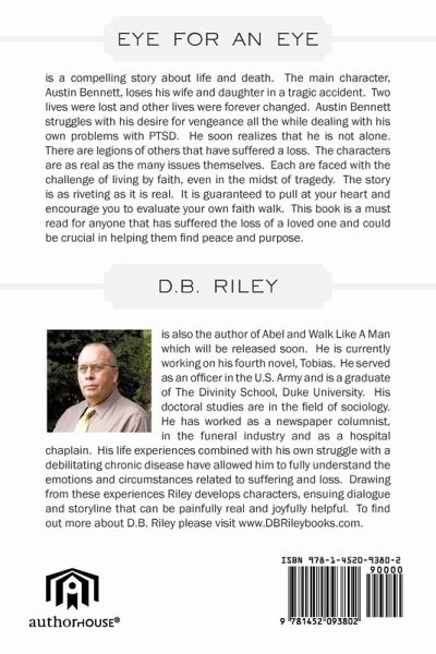 Eye for an Eye is a compelling story about life and death. The main character, Austin Bennett, loses his wife and daughter in a tragic accident. Two lives were lost and other lives were forever changed. Austin Bennett struggles with his desire for vengeance all the while dealing with his own problems with PTSD. He soon realizes that he is not alone. There are legions of others that have suffered a loss. The characters are as real as the many issues themselves. Each are faced with the challenge of living by faith, even in the midst of tragedy. The story is as riveting as it is real. It is guaranteed to pull at your heart and encourage you to evaluate your own faith walk. This book is a must read for anyone that has suffered the loss of a loved one and could be crucial in helping them find peace and purpose.