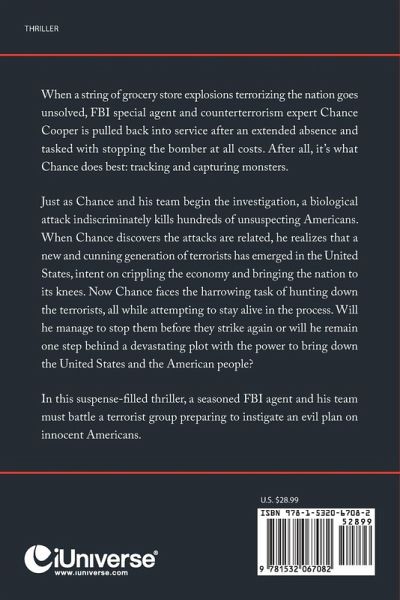 When a string of grocery store explosions terrorizing the nation goes unsolved, FBI special agent and counterterrorism expert Chance Cooper is pulled back into service after an extended absence and tasked with stopping the bomber at all costs. After all, it's what Chance does best: tracking and capturing monsters. Just as Chance and his team begin the investigation, a biological attack indiscriminately kills hundreds of unsuspecting Americans. When Chance discovers the attacks are related, he realizes that a new and cunning generation of terrorists has emerged in the United States, intent on crippling the economy and bringing the nation to its knees. Now Chance faces the harrowing task of hunting down the terrorists, all while attempting to stay alive in the process. Will he manage to stop them before they strike again or will he remain one step behind a devastating plot with the power to bring down the United States and the American people? In this suspense-filled thriller, a seasoned FBI agent and his team must battle a terrorist group preparing to instigate an evil plan on innocent Americans.