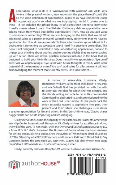 Appreciation, what is it? Is it synonymous with wisdom? Job 28:34 says, 'where is the place of wisdom, man knows not the place thereof' could this be the same definition of appreciation? Many of us have coined the cliché 'I appreciate you' - so what are we truly saying...umh! It causes one to think -- if I've included this phrase in my list of clichés then I need to know what it really means when I use it. The Webster Dictionary defines appreciation as - adding value. How would you define appreciation? Then, how do you add value to someone or something? What are you bringing to the table that would add additional value to a person or event? We make many statements that we have no application for. How do we appreciate? Is there a formula for appreciation? Is it a desire, or is it something we say just to sound nice? The questions are endless. This book is not designed to be limited to only understanding appreciation, but also to trigger your thinking about quoting and re-quoting clichés that are never backed up with action. There are several practical exercises included in this book that are designed to build your life in this area. Does the ability to appreciate at 'Eye-Level' exist? Are we appreciating at 'Eye-Level' with future thoughts in mind? What is the potential of the moment or event? You can't add value for a future event without acknowledging the moment that currently exists. Let's look further...