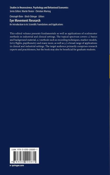 Introduction to the Study of Eye Movements.- Saccades: Fundamentals and Neural Mechanisms.- Fixational Eye Movements.- Smooth eye movements in humans: Smooth pursuit, optokinetic nystagmus and vestibular ocular reflex.- Visual Perception and eye movements.- Scences, saliency maps and scanpaths.- Eye movements during reading.- Eye tracking methodology.- Advanced statistical methods for eye movement analysis and modelling: A gentle introduction.- Advanced statistical methods for eye movement analysis and modelling: A gentle introduction.- Pupillometry.- Functional magnetic resonance imaging of eye movements: Introduction to methods and basic phenomena.- Eye movement recordings in natural settings.- Eye movements in primates - An experimental approach.- Typical and atypical development of eye movement control.- Adult Psychiatry.- Neurology.- Pharmacology.- Neuromarketing.- Neuroeconomics.- User Experience Research and Web Usability.- Vehicle Control.- Human-Computer Interface.