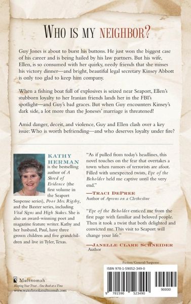 Things Aren't Always How They Appear! Guy Jones is about to burst his buttons. He just won the biggest case of his career and is being hailed by his law partners. But his wife, Ellen, is consumed with her quirky, needy friends and misses his victory dinner. Little does she know that Kinsey Abbott, Guy's pretty legal secretary, is more than happy to keep him company. Communication between the Joneses rapidly deteriorates when Ellen's stubborn loyalty to an Iranian couple lands her in the FBI's spotlight-and Guy's bad graces. Guy soon discovers Kinsey's dark side, which inevitably pulls him into a web of danger and deceit. He decides not to tell Ellen. But it's going to cost him. Who is my neighbor? Guy Jones is about to burst his buttons. He just won the biggest case of his career and is being hailed by his law partners. But his wife, Ellen, is so consumed with her quirky, needy friends that she misses his victory dinner-and bright, beautiful legal secretary Kinsey Abbott is only too glad to keep him company. When a fishing boat full of explosives is seized near Seaport, Ellen's stubborn loyalty to her Iranian friends lands her in the FBI's spotlight-and Guy's bad graces. But when Guy encounters Kinsey's dark side, a lot more than the Joneses' marriage is threatened! Amid danger, deceit, and violence, Guy and Ellen clash over a key issue: Who is worth befriending-and who deserves loyalty under fire? "As if pulled from today's headlines, this novel touches on the fear that overtakes a town when rumors of terrorists are afoot. Filled with unexpected twists, Eye of the Beholder held me captive until the very end." -Traci DePree Author of Aprons on a Clothesline "Eye of the Beholder enticed me from the first page with familiar and beloved people. Then it took a twist that both delighted and convicted me. This visit to Seaport will change your life." -Janelle Clare Schneider, Author Story Behind the Book "My novels don't come to me ahead of time; each book flows off the tips of my fingers as I sit down and begin to 'feel' the issues deep inside myself. For me, the most intriguing aspect of my writing style is that I don't plan and outline the stories. I turn my fingers loose and get inside the characters and instinctively know where I need to go. After all the suspense is said and done, my hope is that each story will give us pause. That in the deepest part of our souls, we'll embrace the depth of what it means to be believers and then be moved to share its powerful simplicity with those who struggle without hope. I want Eye of the Beholder to take readers inside my characters' hearts and minds so they will take an honest look at whether they show favoritism to people of higher social standing. I want them to realize a person's intrinsic value has nothing to do with social class." -Kathy Herman