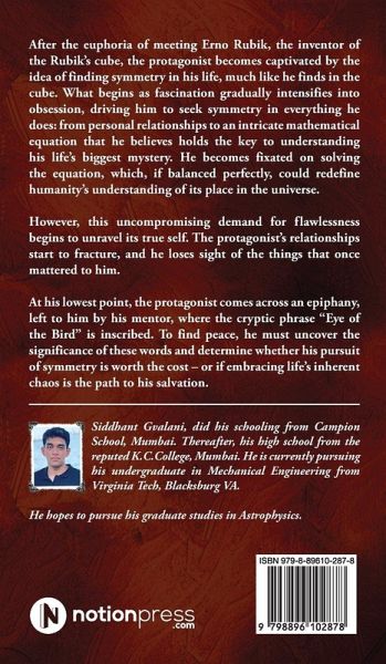 After the euphoria of meeting Erno Rubik, the inventor of the Rubik's cube, the protagonist becomes captivated by the idea of finding symmetry in his life, much like he finds in the cube. What begins as fascination gradually intensifies into obsession, driving him to seek symmetry in everything he does: from personal relationships to an intricate mathematical equation that he believes holds the key to understanding his life's biggest mystery. He becomes fixated on solving the equation, which, if balanced perfectly, could redefine humanity's understanding of its place in the universe. However, this uncompromising demand for flawlessness begins to unravel its true self. The protagonist's relationships start to fracture, and he loses sight of the things that once mattered to him. At his lowest point, the protagonist comes across an epiphany, left to him by his mentor, where the cryptic phrase "Eye of the Bird" is inscribed. To find peace, he must uncover the significance of these words and determine whether his pursuit of symmetry is worth the cost - or if embracing life's inherent chaos is the path to his salvation.
