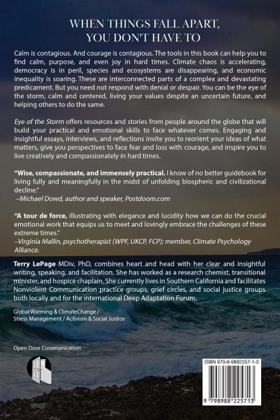 When Things Fall Apart, You Don't Have To Calm is contagious. And courage is contagious. The tools in this book can help you to find calm, purpose, and even joy in hard times. Climate chaos is accelerating, democracy is in peril, species and ecosystems are disappearing, and economic inequality is soaring. These are interconnected parts of a complex and devastating predicament. But you need not respond with denial or despair. You can be the eye of the storm, calm and centered, living your values despite an uncertain future, and helping others to do the same. Eye of the Storm offers resources and stories from people around the globe that will build your practical and emotional skills to face whatever comes. Engaging and insightful essays, interviews, and reflections invite you to reorient your ideas of what matters, give you perspectives to face fear and loss with courage, and inspire you to live creatively and compassionately in hard times. "Wise, compassionate, and immensely practical. I know of no better guidebook for living fully and meaningfully in the midst of unfolding biospheric and civilizational decline." -Michael Dowd, author and speaker, Post-doom.com "A tour de force, illustrating with elegance and lucidity how we can do the crucial emotional work that equips us to meet and lovingly embrace the challenges of these extreme times." -Virginia Mallin, psychotherapist (WPF, UKCP, FCP); member, Climate Psychology Alliance. Chapter one: Facing the storm - What we face, and the emotional impact of realizing what we face, in prose, poem, and story. Chapter two: Stories shape us - Stories that don't work, and stories that may work, to frame our situation. Chapter three: Stories for courage in dark times - Three stories to describe our predicament. They do not have happy endings. They have courageous endings. Chapter four: Practical emotional support - Your toolbox for dealing with difficult emotions. Chapter five: Befriending grief - Learning the skill of grieving to honor love and loss of all kinds. Chapter six: Belonging and reverence - Finding meaning and wonder in relationships and in daily living. Chapter seven: Resigning from the rat race - Slowing down and opting out of industrial consumer busyness and status. Chapter eight: Connection and compassion - Tools for practicing compassion when it matters most. Chapter nine: Letting go - Ways people are letting go of industrial consumer society and having fun doing it. Chapter ten: No more flying solo - Ways people are building relationships for mutual support. Chapter eleven: Young people and those who care about them - How we might be of service to those who inherit this mess. Chapter twelve: Planting seeds - Gardening as activism and relationship. Chapter thirteen: In the meantime - Ways people are living their values now. Chapter fourteen: Endings are beginnings.