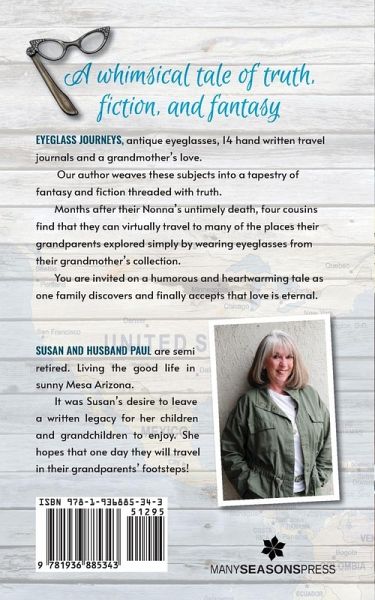 EYEGLASS JOURNEYS, antique eyeglasses, 14 hand written travel journals and a grandmother's love. Our author weaves these subjects into a tapestry of fantasy and fiction threaded with truth. Months after their Nonna's untimely death, four cousins find that they can virtually travel to many of the places their grandparents explored simply by wearing eyeglasses from their grandmother's collection. You are invited on a humorous and heartwarming tale as one family discovers and finally accepts that love is eternal.