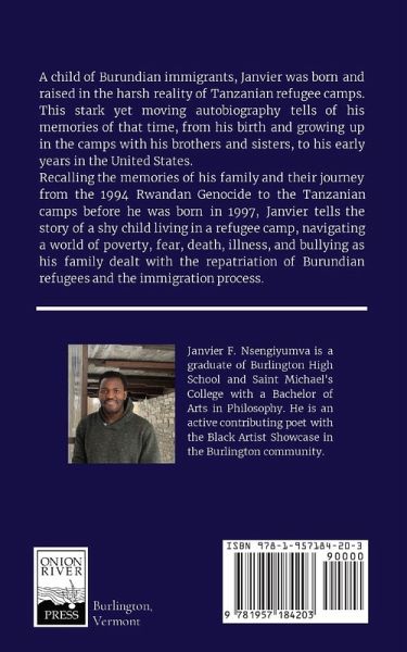 A child of Burundian immigrants, Janvier was born and raised in the harsh reality of Tanzanian refugee camps. This stark yet moving autobiography tells of his memories of that time, from his birth and growing up in the camps with his brothers and sisters, to his early years in the United States. Recalling the memories of his family and their journey from the 1994 Rwandan Genocide to the Tanzanian camps before he was born in 1997, Janvier tells the story of a shy child living in a refugee camp, navigating a world of poverty, fear, death, illness, and bullying as his family dealt with the repatriation of Burundian refugees and the immigration process.