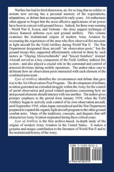 Warfare has had its third dimension, air, for so long that no soldier or airman now serving has a personal memory of the expectations, adaptations, or debate that accompanied its early years. Air enthusiasts often appear to forget that the most effective applications of air power have been in concert with ground forces. Indeed, for three wars running - World War II, Korea, and Vietnam - the close support technique of choice featured airborne eyes and ground artillery. This volume examines the institutional origins of modern Army Aviation by recounting the experiences of the men who flew observed fire missions in light aircraft for the Field Artillery during World War II. The War Department designated these aircraft "air observation posts," but the ground troops they supported affectionately referred to them by such names as "Maytag Messerschmidts" and "biscuit bombers" instead. Aircraft served as a key component of the Field Artillery indirect fire system - and also played a crucial role in the command and control of armored divisions during mobile operations. The author takes care to delineate how air observation posts interacted with each element of the combined arms team. Eyes of Artillery identifies the circumstances and debate that gave rise to the Air-Observation-Post Program. The development of military aviation generated an extended struggle within the Army for the control of aerial observation and posed related questions concerning how air and ground elements should interact with one another. The author gives primary emphasis to the period from January 1939, when the Field Artillery began to actively seek control of its own observation aircraft, until September 1945, when Japan surrendered and the War Department prepared to expand the organic light aircraft program to the other ground combat arms. Many of the traditions, concepts, and disputes that still characterize Army Aviation originated during these critical years.