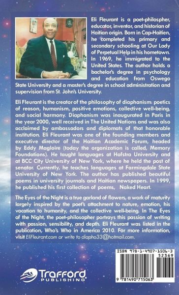 The Eyes of the Night is a true garland of flowers, a work of maturity largely inspired by the poet's attachment to nature, emotion, his vocation to humanity, and the collective well-being. In The Eyes of the Night, the poet-philosopher portrays this passion of writing with passion, sensibility, and depth. Eli Fleurant was listed in the publication, Who's Who in America 2010. For more information, visit EliFleurant.com or write to diapho33@hotmail.com.