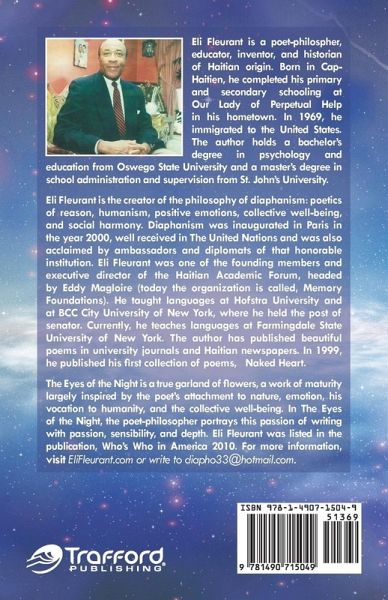 The Eyes of the Night is a true garland of flowers, a work of maturity largely inspired by the poet's attachment to nature, emotion, his vocation to humanity, and the collective well-being. In The Eyes of the Night, the poet-philosopher portrays this passion of writing with passion, sensibility, and depth. Eli Fleurant was listed in the publication, Who's Who in America 2010. For more information, visit EliFleurant.com or write to diapho33@hotmail.com.