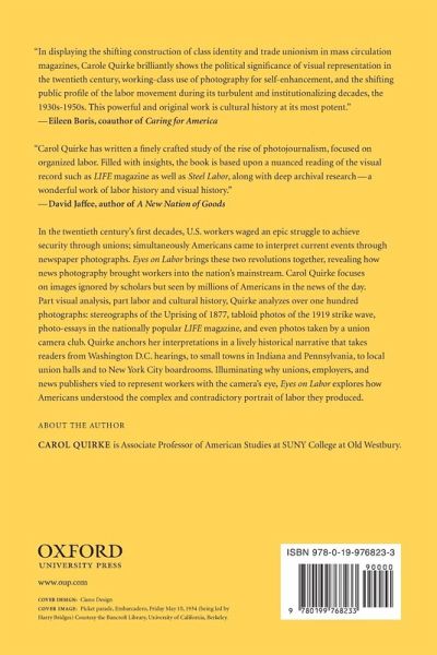 In the twentieth century's first decades, U.S. workers waged an epic struggle to achieve security through unions; simultaneously Americans came to interpret current events through newspaper photographs. Eyes on Labor brings these two revolutions together, revealing how news photography brought workers into the nation's mainstream. Carol Quirke focuses on images ignored by scholars but seen by millions of Americans in the news of the day. Part visual analysis, part labor and cultural history, Quirke analyzes over one hundred photographs: stereographs of the Uprising of 1877, tabloid photos of the 1919 strike wave, photo-essays in the nationally popular LIFE Magazine, and even photos taken by a union camera club. Quirke anchors her interpretations in a lively historical narrative that takes readers from Washington D.C. hearings, to small towns in Indiana and Pennsylvania, to local union halls and to New York City boardrooms. Illuminating why unions, employers, and news publishers vied to represent workers with the camera's eye, Eyes on Labor explores how Americans understood the complex and contradictory portrait of labor they produced.