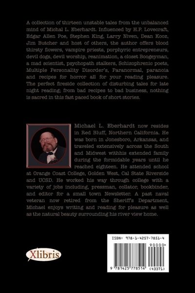 A collection of thirteen unstable tales from the unbalanced mind of Michal L. Eberhardt. Influenced by H.P. Lovecraft, Edgar Allen Poe, Stephen King, Larry Niven, Dean Koonz, Jim Butcher and host of others, the author offers blood thirsty flowers, vampire priests, porphyric entrepreneurs, devil dogs, devil worship, reanimation, a closet Boogeyman, a mad scientist, psychopath stalkers, Schizophrenic poets, Multiple Personality Disorder¿s, paranormal, paranoia and recipes for horror all for your reading pleasure. The perfect fireside collection of disturbing tales for late night reading; from bad recipes to bad business, nothing is sacred in this fast paced book of short stories.