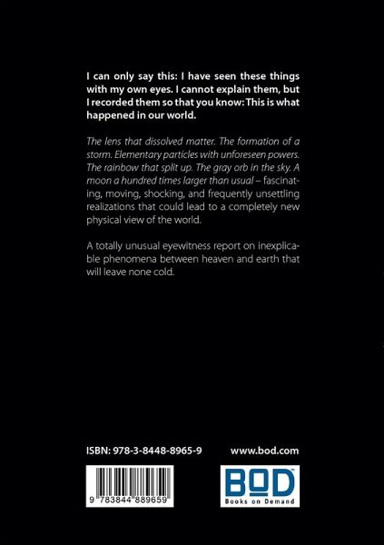 I can only say this: I have seen these things with my own eyes. I cannot explain them, but I recorded them so that you know: This is what happened in our world.The lens that dissolved matter. The formation of a storm. Elementary particles with unforeseen powers. The rainbow that split up. The gray orb in the sky. A moon a hundred times larger than usual - fascinating, moving, shocking, and frequently unsettling realizations that could lead to a completely new physical view of the world.A totally unusual eyewitness report on inexplicable phenomena between heaven and earth that will leave none cold.