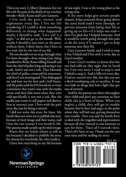 This is my story. I, Albert Quinones, live my life with the pain of the death of my two best friends--Ricky Kasso and Gary Lauwers. I live with the pain, sorrow, and nightmares every day. I live my life wondering if I could've done something differently to change what happened. maybe I should've said, "Let's call it a night," or did not go to the woods. Well, maybe I should've just went to the party without them. I don't know, but I have to live with this for the rest of my life No one should ever see or go through what I've been through--from seeing Gary being murdered to Ricky Kasso killing himself and from the chief of police lying and saying it was a cult. And it was not a cult. Then Howard, the chief of police, retracted his statement, and then I was interrogated. They kidnapped me and beat me for four and a half hours, and the police and the DA forced me to write a statement that wasn't true with the media circus and their fake news when they were told specifically it was not a cult. But the media just wants to sell papers and destroy lives at anyone's cost. I lives with the pain every day just for being a witness. I did not write this story for fame. My family does not want me to publish this story because of their image and their name, and I lost the one woman I ever loved (L.M). Her parents made us split up for their image. Know that my family refuses to talk to me because I decided to publish the story for closure for everybody else who needs it. I have lost everything in my life because of one night. I was at the wrong place at the wrong time. If the story helps give certain people closure, helps someone from going down the same hard road I went through, or prevent someone from losing their life or giving up on life--if it helps one soul--then I'm glad that I helped someone. And it would be worth going through this pain to do the story if it means I got to help someone save their life. Gary Lauwers family and I tried to stop it but I failed and I live with it every day to Gary's mother I want Gary's mother to know that her son had told me that night that he loved her. I am very sorry. I tried to stop it, and I failed to stop it. And it kills me every day. I had no control over this, but this was not a devil-worshiping cult or sacrifice. It was two kids on drugs that had a fight that got out of control And for the parents out there who neglect their child and don't pay attention to their child, this is a form of abuse. When you neglect a child, they will get in trouble because they're hurt and angry to the point where they will lash out, getting themselves into trouble. Then you and the family have to deal with the tragedies and repercussions because all they wanted to was someone to care for them . That's all I wanted--love. That's all I have to say. Thank you for you your time and for reading my story.
