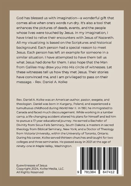 God has blessed us with imagination-a wonderful gift that comes alive when one's words run dry. It's also a tool that enhances the pictures of deeds, events, and the people whose lives were touched by Jesus. In my imagination, I have tried to relive their encounters with Jesus of Nazareth. All my visualizing is based on the Scriptures and historical background. Each person had a special reason to meet Jesus. Each person has left an example for someone in a similar situation. I have attempted to have them tell us what Jesus had done for them. I also hope that the Man from Galilee may draw you into His circle of witnesses. Let these witnesses tell us how they met Jesus. Their stories have convinced me, and I am privileged to pass on their message. - Rev. Daniel A. Kolke
