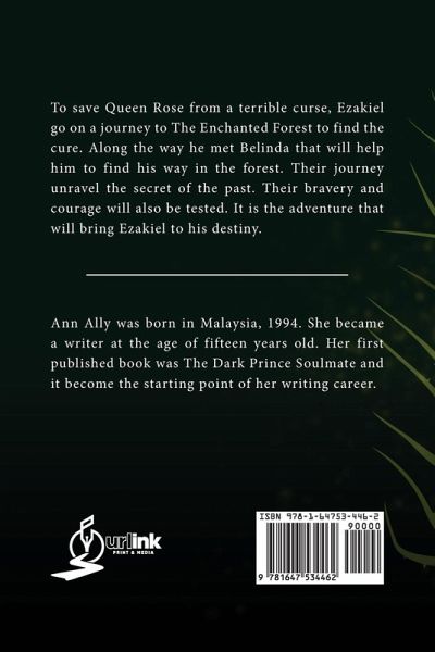 BOOK SUMMARY/SYNOPSIS: To save Queen Rose from a terrible curse, Ezakiel go on a journey to The Enchanted Forest to find the cure. Along the way he met Belinda that will help him to find his way in the forest. Their journey unravel the secret of the past. Their bravery and courage will also be tested. It is the adventure that will bring Ezakiel to his destiny. ABOUT THE AUTHOR Ann Ally was born in Malaysia, 1994. She became a writer at the age of fifteen years old. Her first published book was The Dark Prince Soulmate and it become the starting point of her writing career.