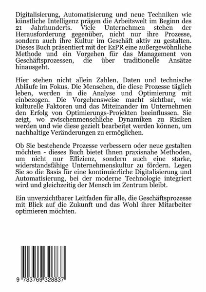 Am Beginn des 21. Jahrhunderts prägen Digitalisierung, Automatisierung und Künstliche Intelligenz die Arbeitswelt. Viele Unternehmen stehen vor der Herausforderung, nicht nur ihre Prozesse, sondern auch ihre Unternehmenskultur aktiv zu gestalten. Dieses Buch präsentiert mit der EzPR eine außergewöhnliche Notation und ein Vorgehen für das Geschäftsprozess-Management, die über traditionelle Ansätze hinausgeht. Hier stehen nicht allein Zahlen, Daten und technische Abläufe im Fokus. Die Menschen, die diese Prozesse täglich leben, werden in die Analyse und Optimierung mit einbezogen. Die Notation macht sichtbar, wie kulturelle Faktoren und das Miteinander im Unternehmen den Erfolg von Optimierungsprojekten beeinflussen. Sie zeigt, wo zwischenmenschliche Dynamiken zu Risiken werden und wie diese gezielt bearbeitet werden können, um nachhaltige Veränderungen zu ermöglichen. Ob Sie bestehende Prozesse verbessern oder neue gestalten möchten - dieses Buch bietet Ihnen praxisnahe Methoden, um nicht nur Effizienz, sondern auch eine starke, widerstandsfähige Unternehmenskultur zu fördern. Legen Sie so die Basis für eine kontinuierliche Digitalisierung und Automatisierung, bei der moderne Technologie integriert wird und gleichzeitig der Mensch im Zentrum bleibt. Ein unverzichtbarer Leitfaden für alle, die Geschäftsprozesse mit Blick auf die Zukunft und das Wohl ihrer Mitarbeiter optimieren möchten.
