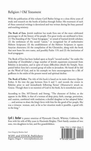 With the publication of this volume Cyril Barber brings to a close thirty years of study and research on the books of Joshua through Esther. His treatment of each of these canonical writings is devotional and was written during his busy pastoral and teaching ministry. The Book of Ezra. Jewish tradition has made Ezra one of the most celebrated personages in all the history of his people. Five great works are attributed to him: (1) The founding of the ""Great Synagogue,"" or synod of learned Jewish scholars; (2) the settlement of the sacred ""canon,"" or recognized list of authoritative Hebrew Scriptures; (3) the establishment of the Hebrew Scriptures in square Assyrian characters; (4) the compilation of the Chronicles, along with the book that now bears his own name, and possibly Psalm 119; and (5) the institution of local synagogues. The Book of Ezra has been looked upon as Israel's ""second exodus,"" for under the leadership of Zerubbabel a large number of Jewish expatriates journeyed from Babylon to Jerusalem, and in spite of many difficulties rebuilt the Temple. Years passed before Ezra led a second group of exiles to Jerusalem. He based all he did on the Word of God, and in his example we have encouragement for a life of godliness in the midst of the present moral and spiritual decline. The Book of Esther. The title of this book is based on its main character, Queen Esther. It fits into the gap between Ezra 6 and 7, and records the events in Babylon prior to and immediately following Xerxes' (Ahasuerus's) attack on Greece. Though there is no mention of God in the book, he is nonetheless active. According to Drs. M'Clintock and Strong, ""The character of Esther, as she appears in the Bible, is that of a woman of deep piety, faith, courage, patriotism, and caution, combined with resolution; a dutiful daughter to her adopted father . . . and anxious to share the king's favor with him for the good of her people. She was a virtuous woman, and as far as her situation made it possible, a good wife to the king.""